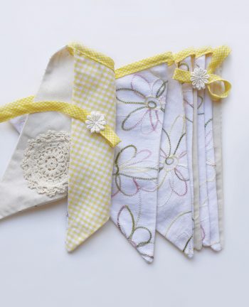 This bright and fresh bunting has a lovely combination of soft apricot and lemon tones and two types of floral patterns that will brighten up any little girls bedroom. It can be hung on a wall or diagonally across the corner of a room as the designs can be viewed from both sides. Bunting length is 200cm plus 32cm of extra length each end for hanging/tying. Apricot Blossom Vintage features 9 flags sized at 19.5cm wide x 11cm deep with various alternating patterns held together by top quality apricot gingham bias.