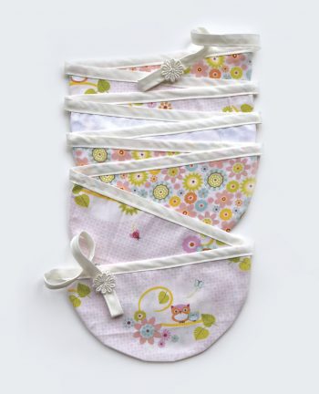 This bunting features 12 flags sized at 16cm wide x 19.5cm deep with alternating patterns. Can be hung on a wall or diagonally across a room as the designs can be viewed from both sides. Flag length is 210cm plus 15cm of extra length each end for hanging. Soft lemon bias and detailed rosettes on the ends of the ties bring together a quality piece to suit any baby girls nursery.