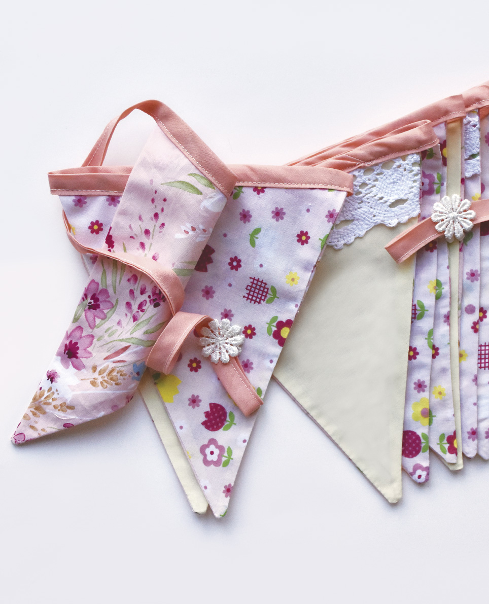 This bright and fresh bunting has a lovely combination of soft apricot and lemon tones and two types of floral patterns also featuring 3 lace trims, that will brighten up any little girls bedroom. It can be hung on a wall or diagonally across the corner of a room as the designs can be viewed from both sides. Bunting length is 210cm plus 35cm of extra length each end for hanging/tying. Apricot Blossom features 12 flags sized at 16cm wide x 19cm deep with various alternating patterns.