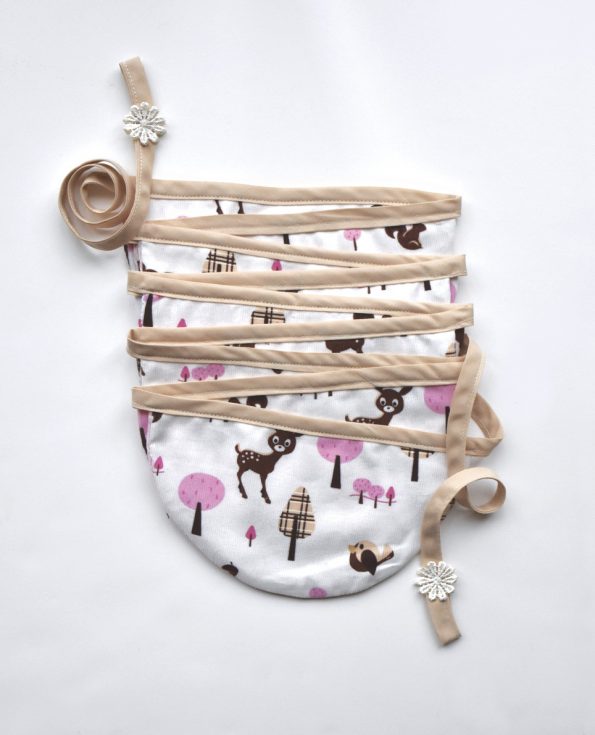 This bunting features 9 flags sized at 19.5cm wide x 11cm deep with alternating patterns. Can be hung on a wall or diagonally across a room as the designs can be viewed from both sides. Bunting length is 195cm plus 40cm of extra length each end for hanging. Beige bias, lace features and detailed rosettes on the ends of the ties complement this quality piece to suit any baby girls nursery.