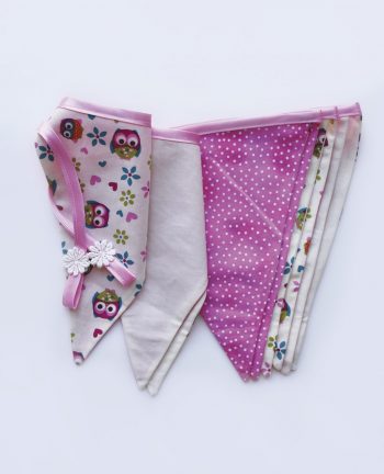 This lovely little girls bunting has a combination of bold raspberry and lime colours. With a mix of floral, spots and cross hatch it brings together a bright and fun butting. It can be hung on a wall or diagonally across the corner of a room as the designs can be viewed from both sides. This round bunting length is 194cm plus 32cm of extra length each end for hanging/tying. Raspberry Treat features 9 flags sized at 19.5cm wide x 11cm deep with alternating patterns and lemon bias.