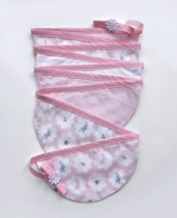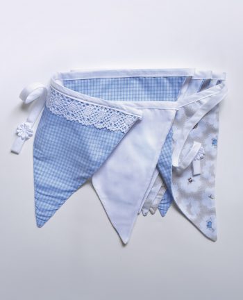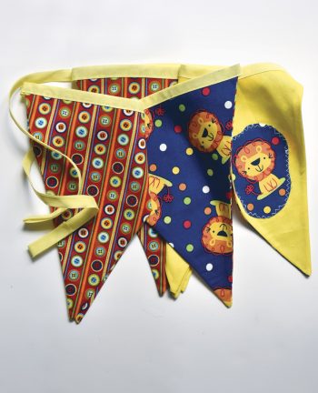 This bunting features 11 flags sized at 16.5cm wide x 19cm long with alternating patterns. Can be hung on a wall or diagonally across a room as the designs can be viewed from both sides. Bunting length is 190cm plus 32cm of extra length each end for hanging/tying. A quality piece featuring simple tigers, monkey’s elephants, giraffes and lions in lovely pastel colours with a lemon base to complement your nursery.