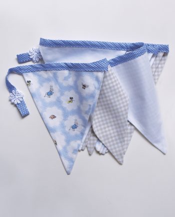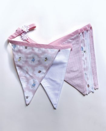 This bunting features 9 flags sized at 20cm wide x 11cm deep with alternating patterns. Can be hung on a wall or diagonally across a room as the designs can be viewed from both sides. Flag length is 192cm plus 24cm of extra length each end for hanging/tying. Crisp white bias and detailed rosettes completing the ends of the ties bring together a quality piece to suit any baby girls nursery.